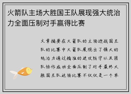 文章摘要:在火箭队的主场迎战国王队的比赛中,火箭队展现出了强大的统治力,通过精准的进攻、防守以及团队协作,成功全面压制了对手,最终大胜国王队。这场比赛不仅仅是一个单纯的胜利,更是火箭队实力的体现,展示了他们在各个方面的优越性。从球员的个人表现到团队协作,再到战术的执行,每个环节都充分体现了火箭队的高水平竞技状态。通过四个方面的详细分析,我们将深入探讨火箭队如何在这场比赛中展现出强大的压制力,并通过全面的压制赢得比赛。
