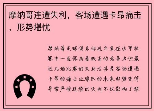 摩纳哥足球俱乐部近年来在法甲联赛中一直保持着较高的竞争力,但最近几场比赛的失利,尤其是客场遭遇卡昂的痛击,让球队的未来形势变得异常严峻。连续的失利不仅影响了球队的排名,更让球队的士气受到了严重打击。本文将从四个方面详细分析摩纳哥近期连遭失利、客场遭遇卡昂痛击的原因及其对球队未来的影响,分别从战术问题、球员状态、球队管理以及对手的表现四个方面展开讨论,旨在全面了解摩纳哥的困境,并预测其未来的走向。
